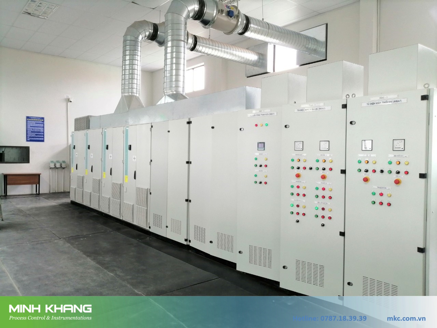 -Hệ thống tủ điện điều khiển, bàn điều khiển: Là hệ thống tủ điện chứa các thiết bị đo lượng, bảo vệ, các thiết bị thực hiện chức năng điều khiển logic như đèn báo, nút nhấn để điều khiển hệ thống tải (bơm, quạt, máy nén khí,..)